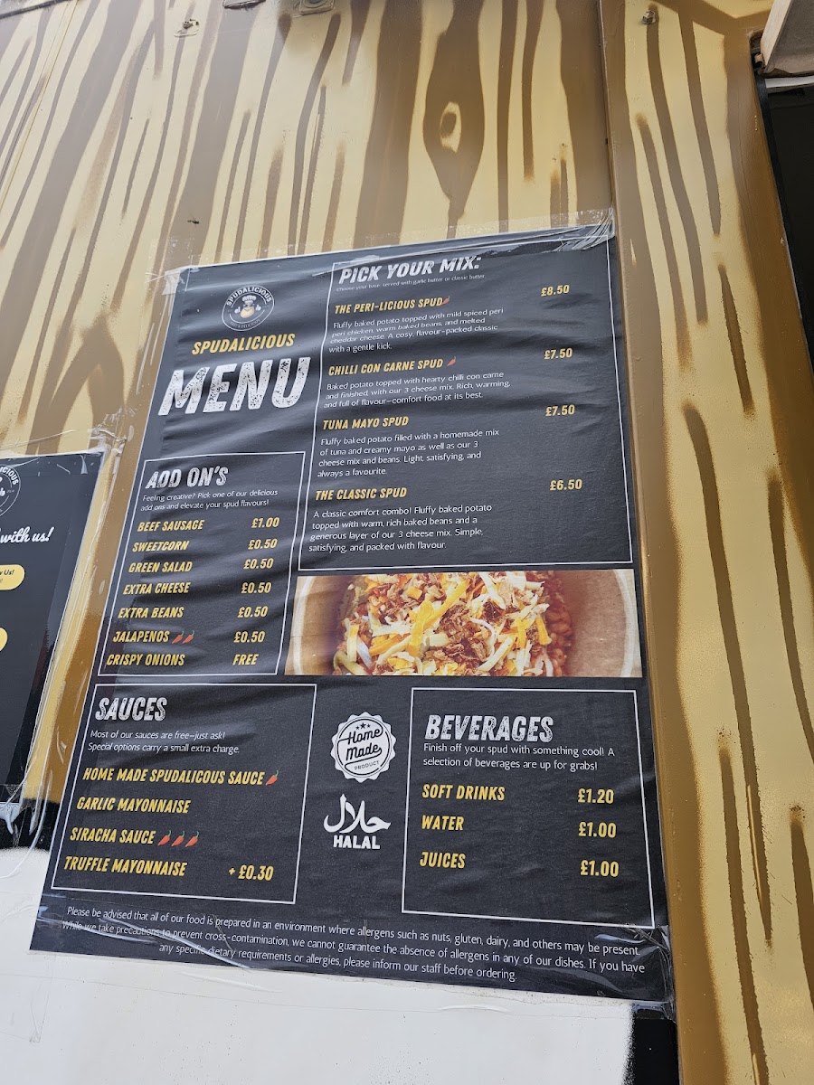 Completing your meal is the homemade Spudalicious sauce, adding a unique twist to every bite. Don't forget to wash it down with refreshing soft drinks or juices, all reasonably priced.